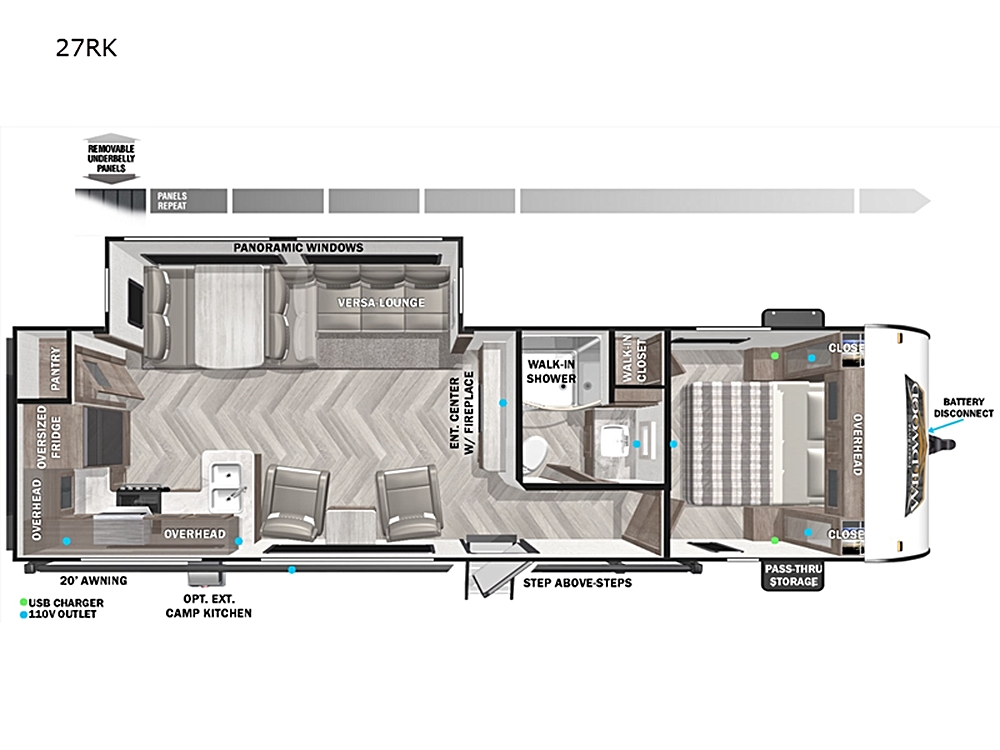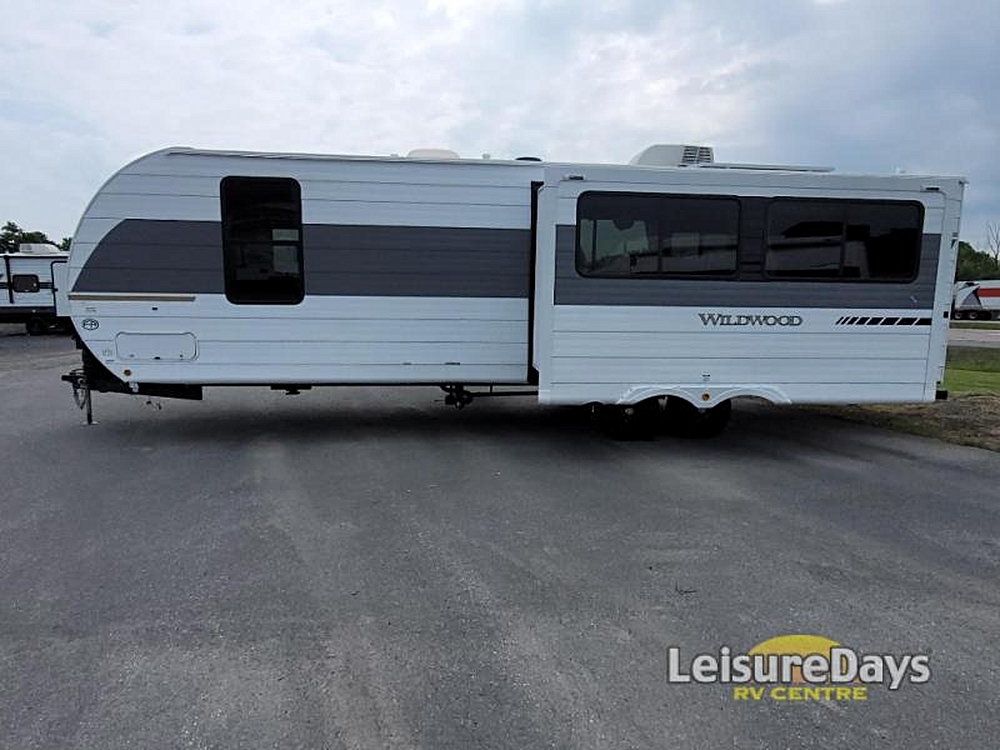 Forest River Wildwood travel trailer 26RBS highlights: Walk-In Shower Versa Lounge Panoramic Windows Custom King Bed with Versa-Tilt Exterior Camp…