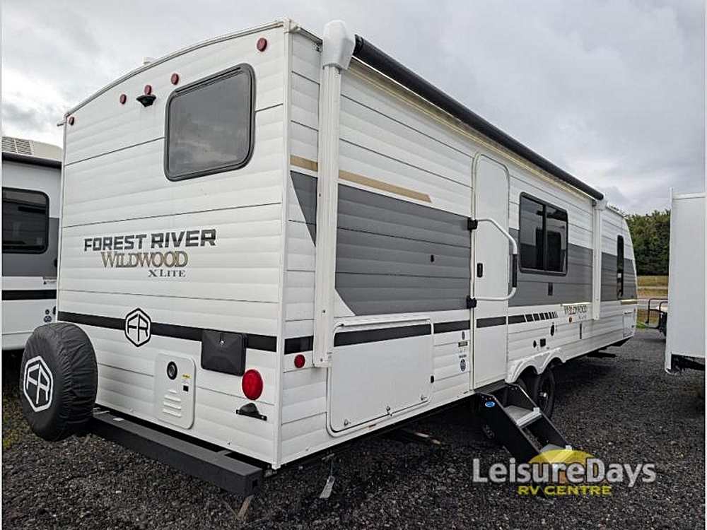 Forest River Wildwood travel trailer 32BHDS highlights: Private Bunkhouse Outdoor Kitchen U-Shaped Dinette Dual Entry Panoramic Windows Pass-Through Storage  …