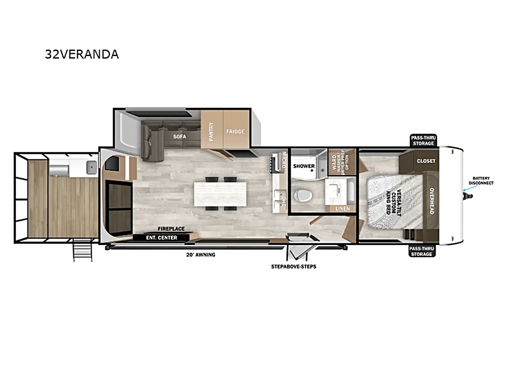 Forest River Wildwood travel trailer 32VERANDA highlights: Rear Veranda/Porch Full Bath 20' Awning Fireplace Kitchen Island with Four Chairs  …