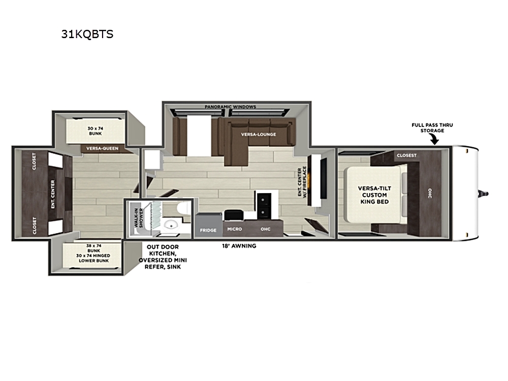 Forest River Wildwood travel trailer 31KQBTS highlights: Spacious Bunkhouse Panoramic Windows Outside Kitchen Fireplace 18' Power Awning  With this…
