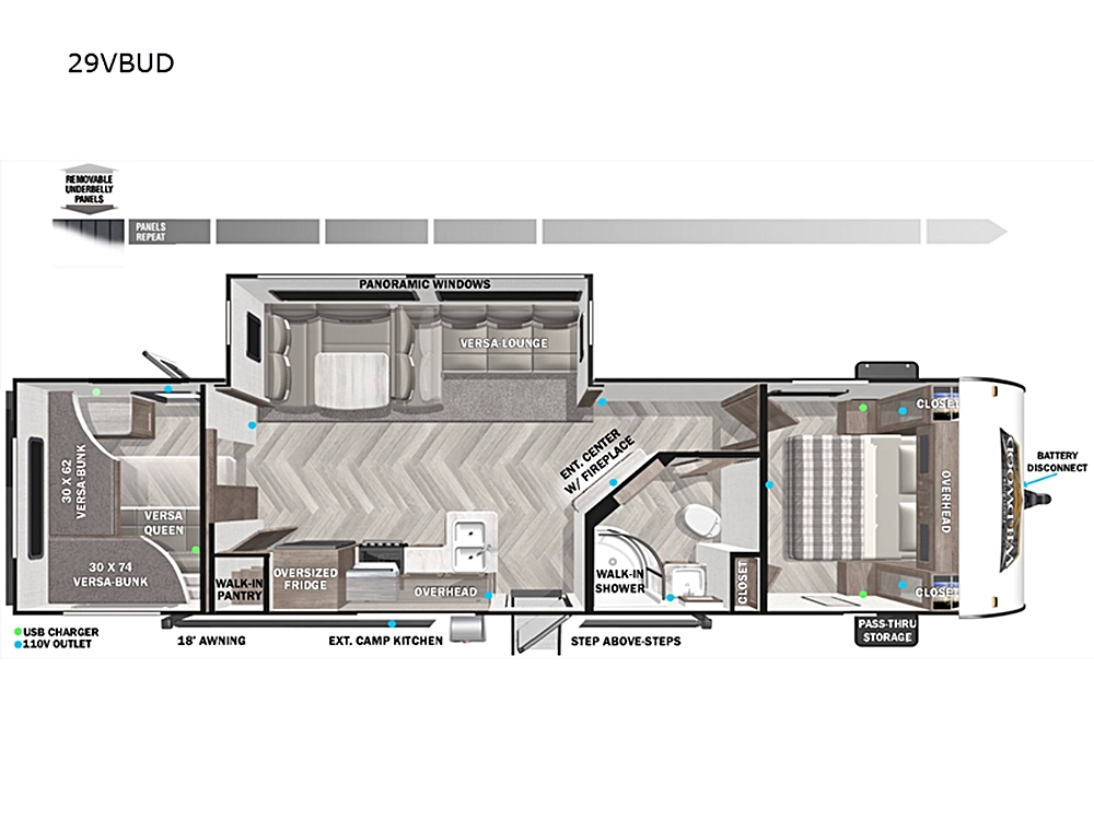 Forest River Wildwood travel trailer 29VBUD highlights: Rear Bunkhouse Panoramic Windows Outdoor Camp Kitchen Versa Lounge Front Private Bedroom Fireplace…